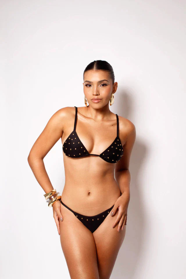 Conheça o Biquíni Ipanema, uma peça que combina estilo e sofisticação em cada detalhe. Com um design único, este biquíni se destaca pelas aplicações de tachinhas douradas feitas manualmente, que proporcionam um toque de glamour, ideal para quem deseja brilhar na praia.