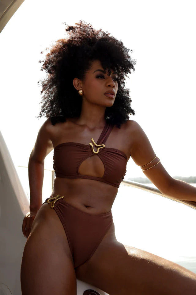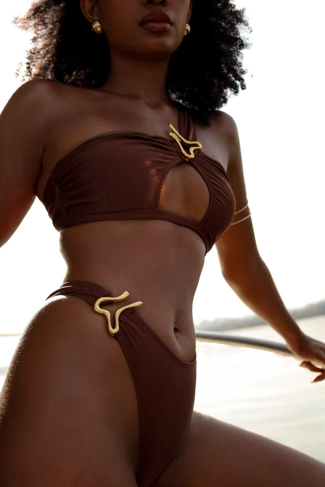 • Possui aviamento no top e na tanga em formato orgânico, banhado a ouro 18k.