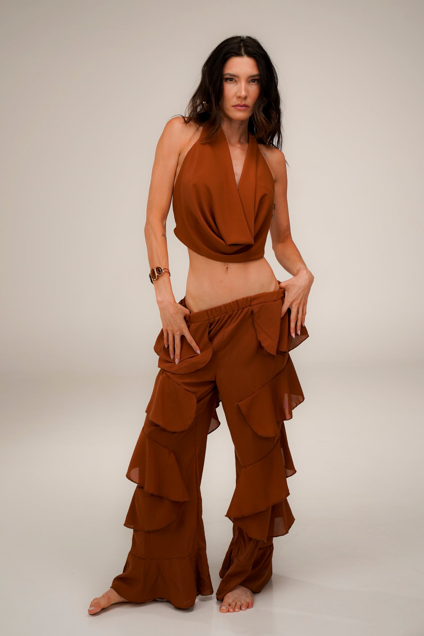 A Calça Ondas é confeccionada em um tecido fluido e leve, que garante movimento e um caimento impecável. Seu design inspirado nas ondas do mar traz camadas delicadas que criam um visual sofisticado e cheio de fluidez. Possui cintura com elástico para um ajuste confortável e perfeito ao corpo, uma peça versátil e elegante para compor looks com leveza.