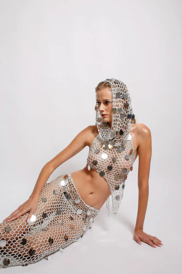 Apresentamos o Conjunto de Crochê Prata, a escolha ideal para quem deseja brilhar neste Carnaval! Composto por um capuz estiloso, um top encantador e uma saia longa, este conjunto é feito artesanalmente, garantindo qualidade e exclusividade em cada detalhe.