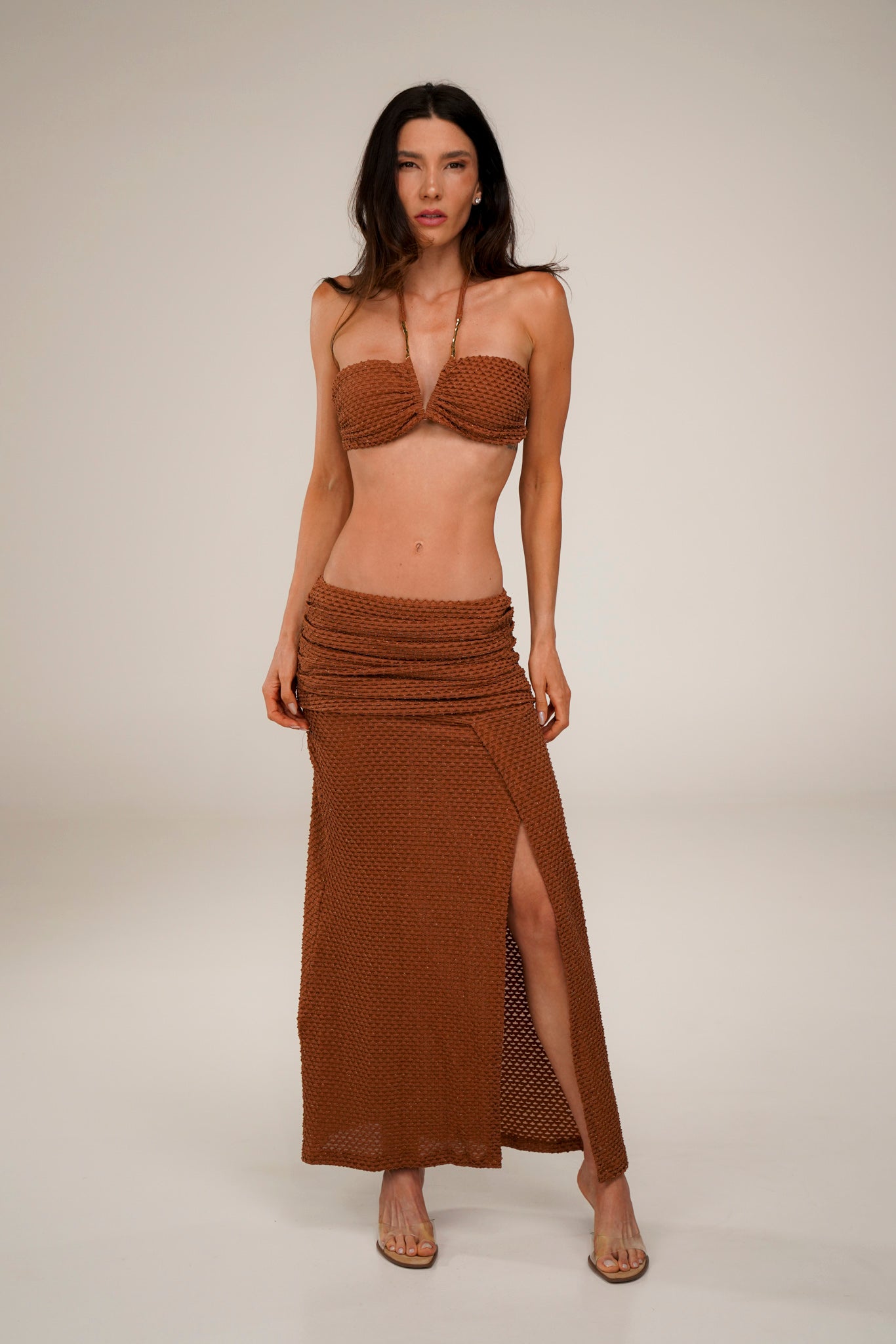 A Saia Mare é um modelo longo confeccionado no tecido texturizado que lembra escamas, com um brilho sutil do lurex que traz sofisticação ao visual. A peça possui uma sobreposição de tecido com drapeados laterais que valorizam a silhueta, além de uma fenda frontal que adiciona leveza, movimento e charme ao look.
